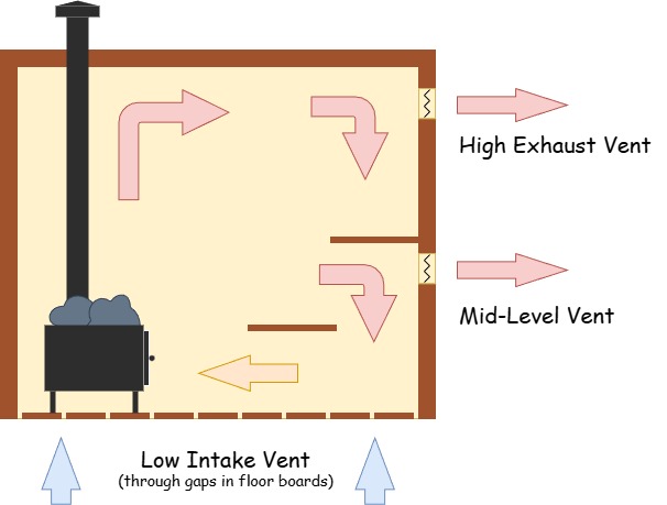 Sauna airflow and 3-vent ventilation in a Minnesota Mobile Sauna.